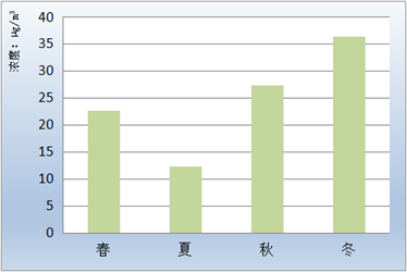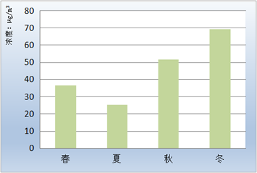 PM2.5浓度月均值、季均值变化见表4、图5和图6。冬季浓度最高,秋季次之,春、夏季较低。