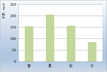 臭氧各月第90百分位数浓度、季第90百分位数浓度变化见表7、图11和图12。夏季浓度较高,春、秋次之,冬季较低。