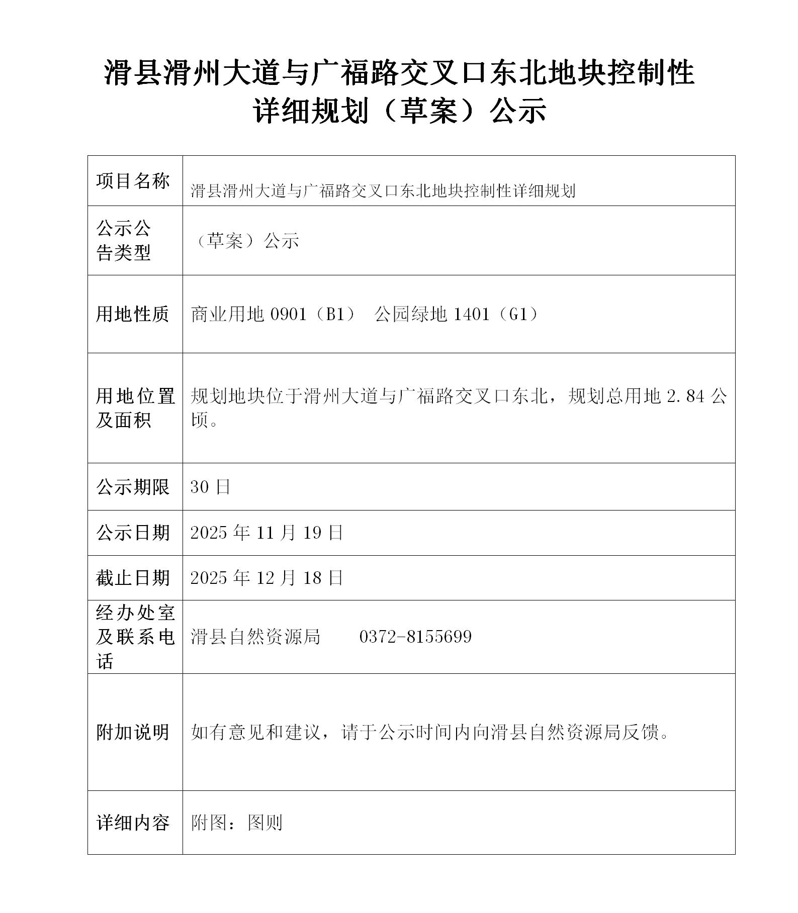 滑县滑州大道与广福路交叉口东北地块控制性详细规划(草案)公示